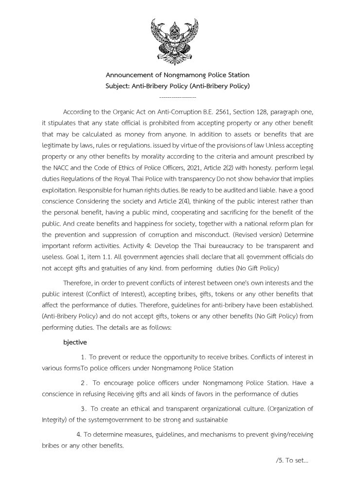 แสดงประกาศนโยบายการต่อต้านการรับสินบน (Anti-Bribery Policy) โดยหัวหน้าสถานีตำรวจคนปัจจุบัน ในปีงบประมาณ พ.ศ. 2568 และให้เผยแพร่เป็นภาษาไทยและภาษาอังกฤษ