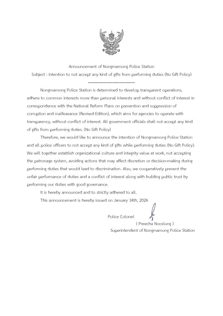 แสดงภาพอินโฟกราฟิกนโยบายไม่รับของขวัญและของกำนัลทุกชนิด (No Gift Policy)จากการปฏิบัติหน้าที่ ทั้งภาษาไทยและภาษาอังกฤษ โดยให้แสดงไว้บนหน้าแรกของเว็บไซต์หลักของหน่วยงานเท่านั้น คลิ๊กดูหน้าเเรกที่นี่แสดงภาพการเผยแพร่ ณ จุดบริการ และจุดประชาสัมพันธ์ที่เห็นได้อย่างชัดเจน