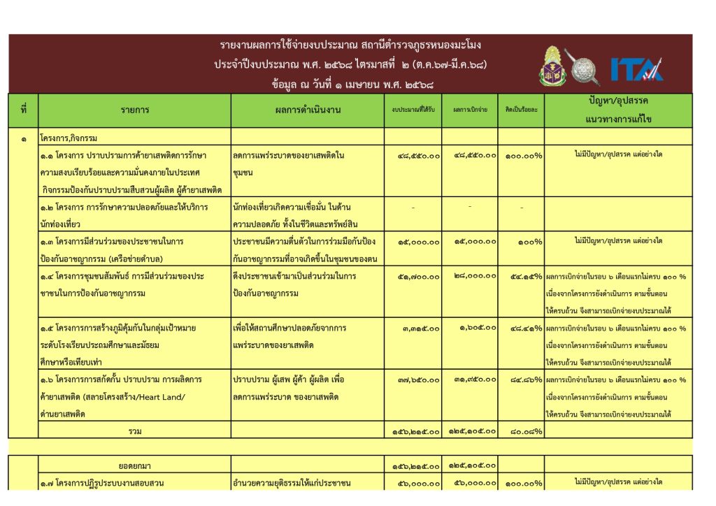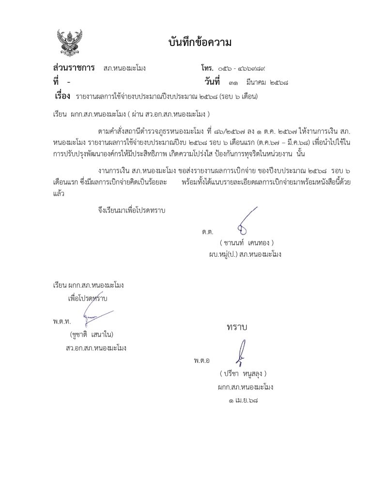 รายงานผลการใช้จ่ายงบประมาณ สภ.หนองมะโมง ประจำปี 2568